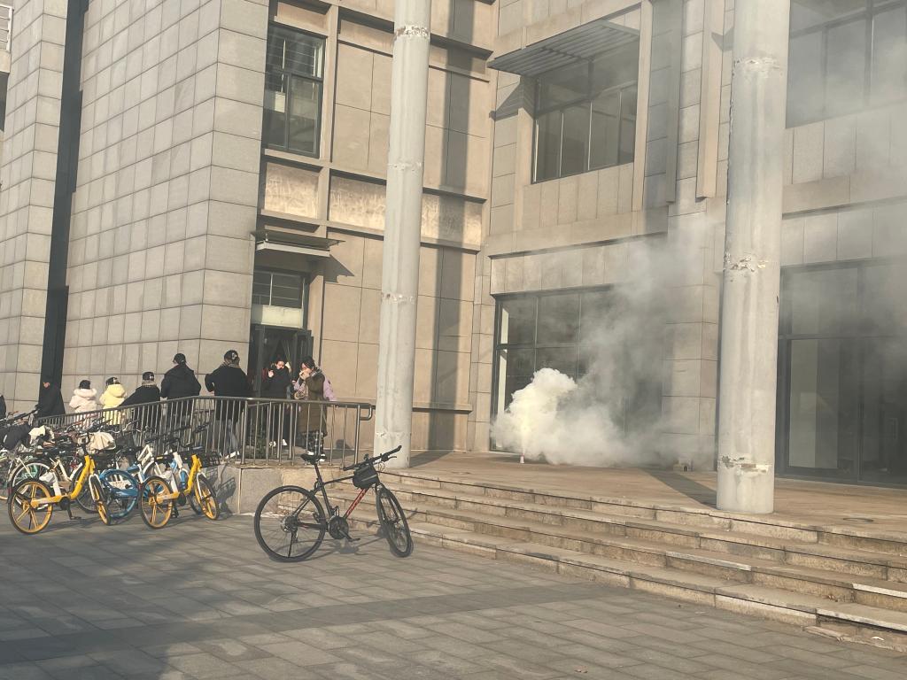 为确保演练活动安全有序进行,bwin必赢登录入口和保卫处预先制定演练方案,勘察场地,规划疏散路线。下午2时30分,演练正式开始。烟雾施放人员在明理楼前和楼内既定位置点燃烟弹模拟火灾发生,楼内逃生演练广播响起,楼内师生迅速、有序离开实验室和教室,并由最近安全出口俯身低姿、掩住口鼻穿过“烟雾”疏散至楼外安全区域。紧接着,学校保卫处向师生详细讲解、演示了灭火器、灭火毯等消防器材的使用方法和注意事项。我院师生也纷纷踊跃上场实际使用灭火器进行灭火。